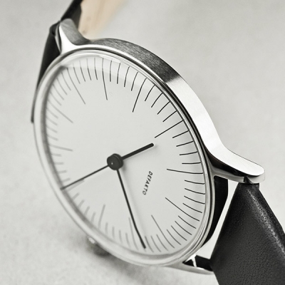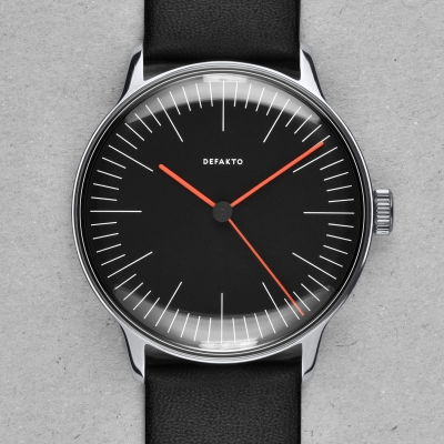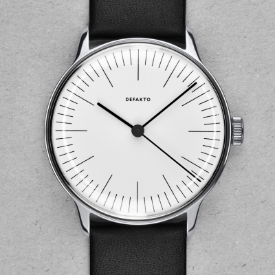 Our new one hand watch Defakto Detail PVD is available with black or white dial. The purist watch comes along with a 5 minute scaled dial and an ultra flat 6.6 mm stainles steel case. All indexes have the same linewight and double their length according to the represented dimension of time.
