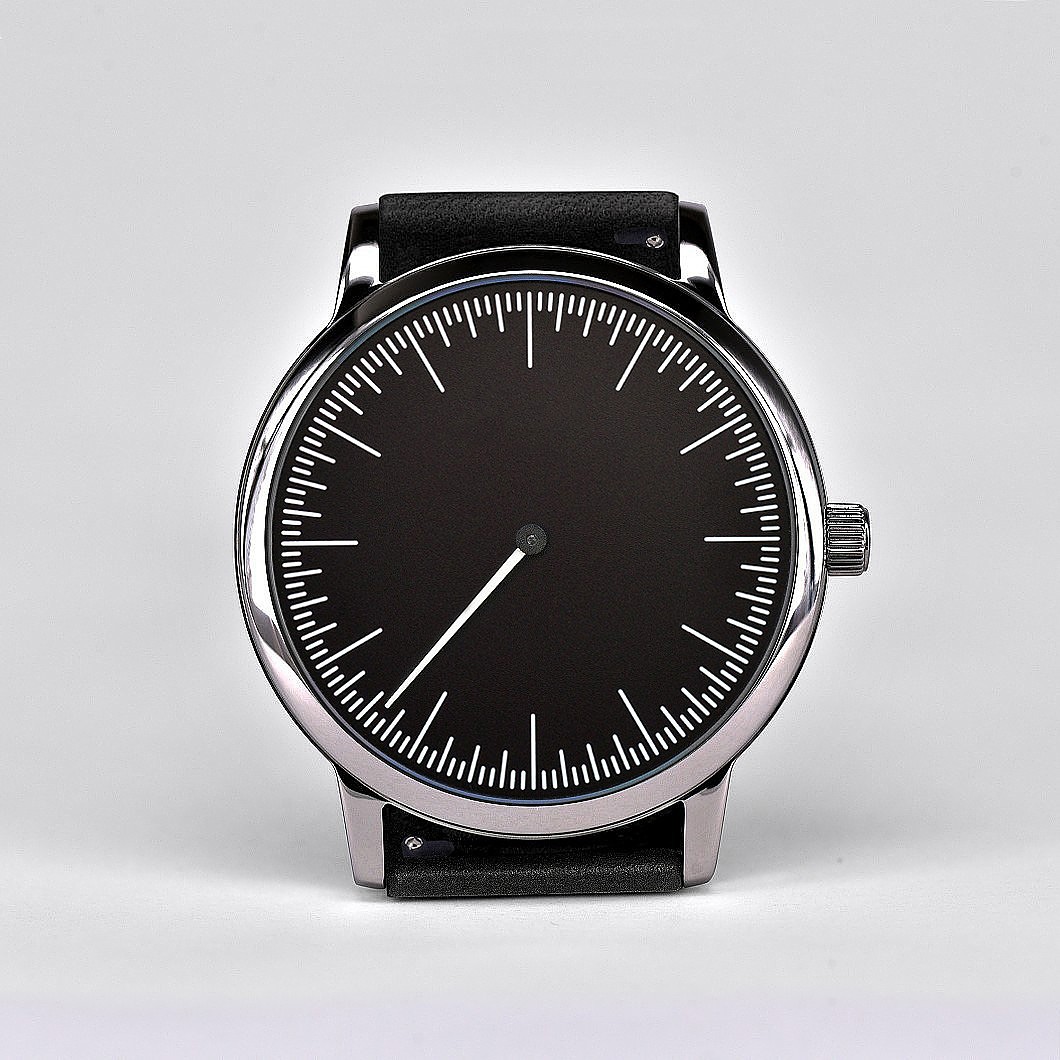 Our new one hand watch Defakto Detail PVD is available with black or white dial. The purist watch comes along with a 5 minute scaled dial and an ultra flat 6.6 mm stainles steel case. All indexes have the same linewight and double their length according to the represented dimension of time.