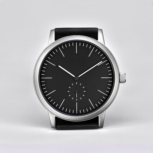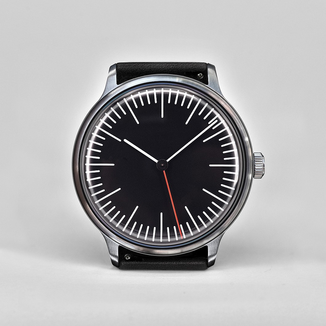 The minimalistic three-hand watch Defakto Struktur Inkognito (40 mm x 46.8 mm x 6.6 mm, weight 45 g) with fluorescent hands is characterized by its ultra-flat 6.6 mm stainless steel case and its characteristically scaled dial. Together they make up a highly functional, understated watch.