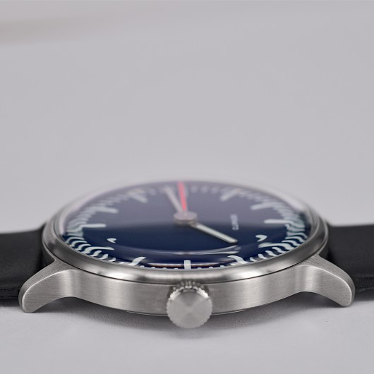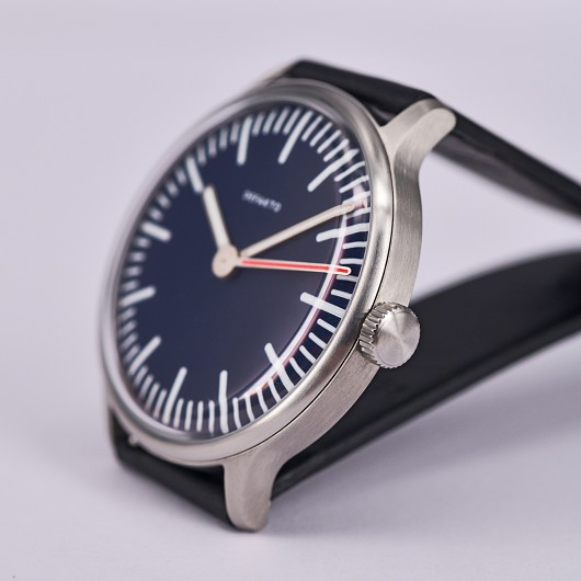 It offers unique modern aesthetics combined with high quality components such as a new in-house made 3-piece watchcase with brushed surface, a konvex sapphire crystal and a swiss made automatic movement. In the elaborate design process, great importance was placed on night readability. The curved hands, as well as all the indices of the dark blue black matte dial, have been covered in Switzerland with Superluminova (bgw9 and red).
